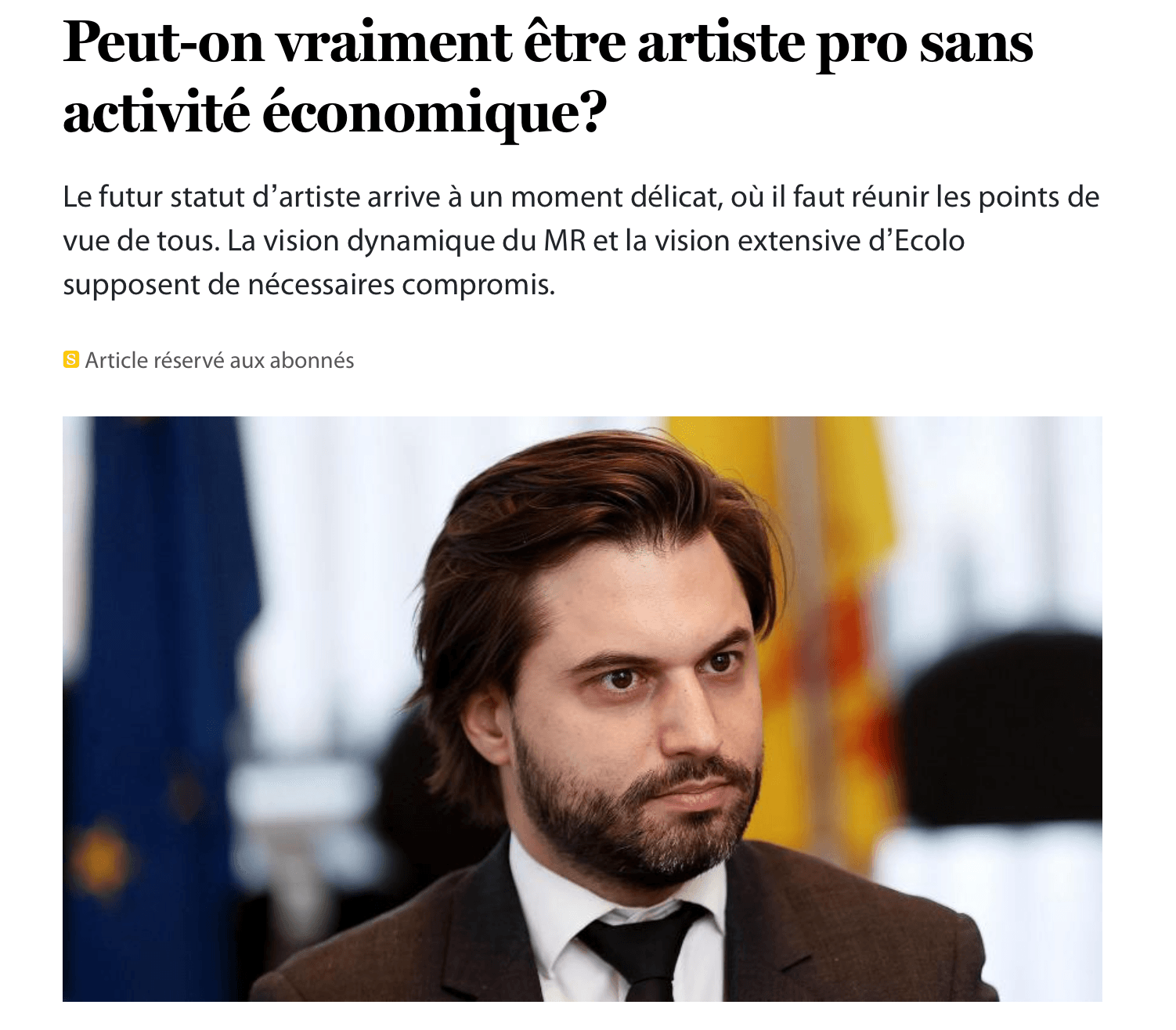 Le statut d’artiste doit avoir pour objectif d’aller vers l’emploi », analyse le ministre des indépendants David Clarinval (MR) : « Nous y voyons un tremplin là où certains y voient une finalité. » Cette dynamique du « tremplin vers d’autres statuts » manque à ce stade aux textes élaborés au fédéral pour aboutir à un nouveau statut d’artiste : « Dans la vision que nous avions développée, nous avions mis des plafonds et des seuils pour permettre à l’artiste de passer à un moment donné au statut d’indépendant », rappelle le président du MR Georges-Louis Bouchez, et dans les projets sur la table « ce n’est pas le cas. C’est problématique car on facilite et on maintient un statut précaire, comme si l’artiste n’était pas lui-même un travailleur à part entière d’un secteur économique. Pour nous, le statut d’artiste doit plutôt être une porte d’entrée. » Cette vision dynamique du statut, fort différente du projet socio-culturel développé par Ecolo, pourrait déjà expliquer à elle seule les tensions survenues ces dernières semaines en intercabinets et qui ont justifié la « pause pascale » dans l’élaboration du statut d’artiste (Le Soir du 11 avril). Si ce n’était que cela, il suffirait d’associer davantage le cabinet Clarinval aux projets développés par le cabinet des Affaires sociales (Vandenbroucke, Vooruit) concernant la nouvelle « commission du travail des arts » et celui de l’Économie (Dermagne, PS) concernant les dérogations à la réglementation chômage. « Si on veut vraiment réussir, ce serait plus intelligent de l’associer largement », confirme Georges-Louis Bouchez.