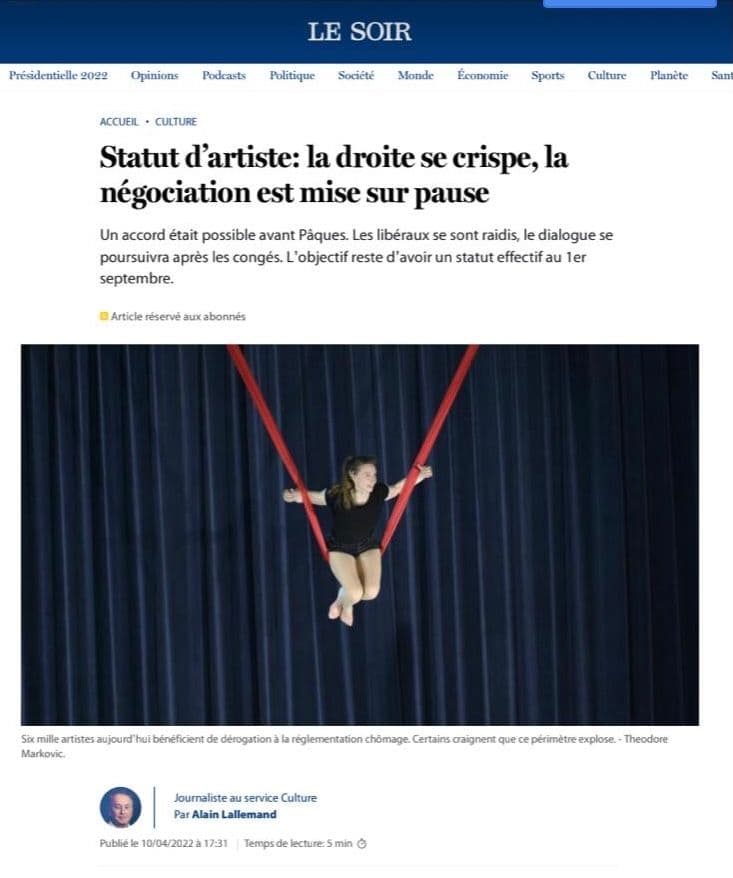 d’artiste, « parce que je me souviens des grandes sorties du MR au début de la crise et leur idée d’“artiste un jour, artiste toujours”. Je pense qu’ils ont même fait un séminaire sur le statut d’artiste. Je me demande ce qui les préoccupe puisque je pense que nous avions tous la même vision en matière de protection sociale de ce secteur particulièrement touché par la crise. »
